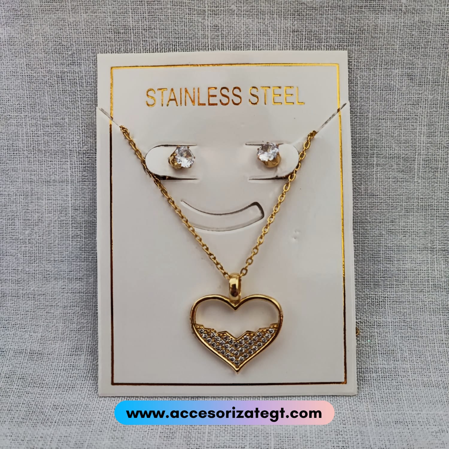 Set de cadena y aretes de acero dorado con dije de corazón decorado con cristales transparentes.