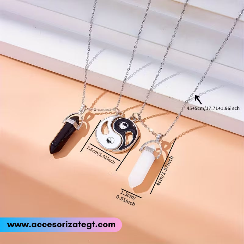 Set de cadenas para pareja o amistad con dijes de yin yang y péndulos de cristal en colores blanco y negro.