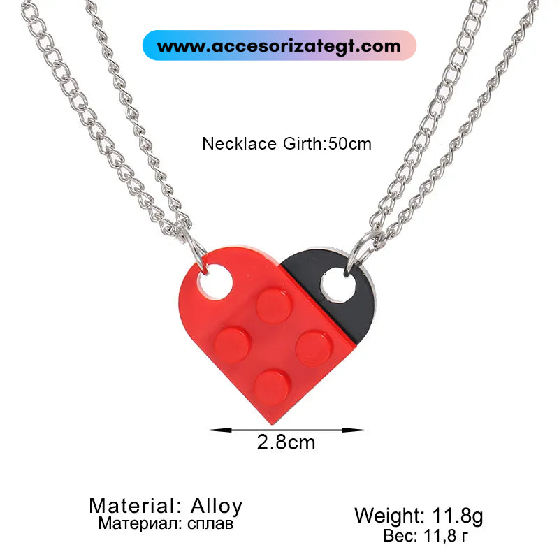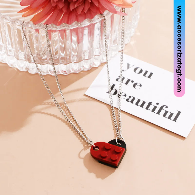 Set de cadenas para pareja con dije de corazón formado por dos piezas de lego en colores rojo y negro.