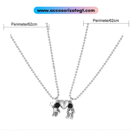 Set de cadenas para pareja o amistad en color plata, con dijes de astronautas e imanes que juntos forman un corazón.