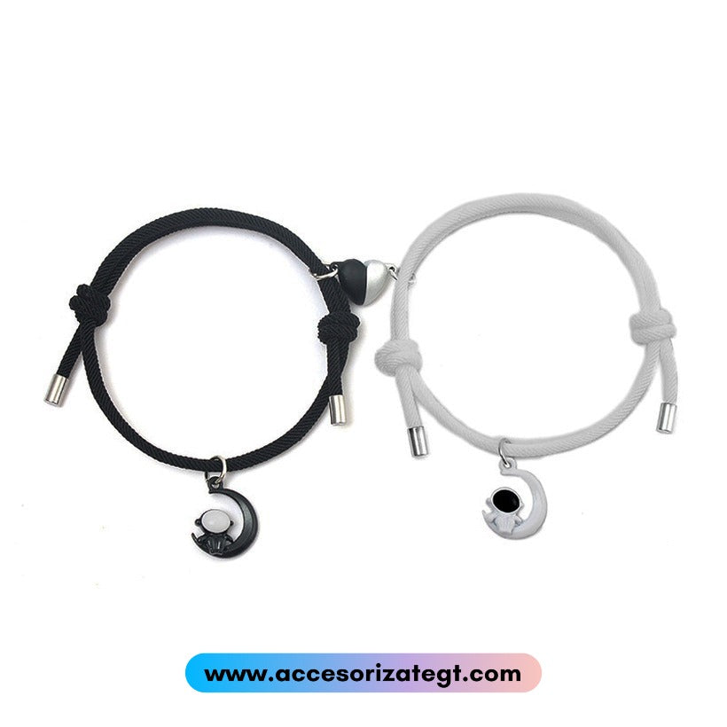 Set de pulseras para pareja elaboradas en cordón en colores blanco y negro con dijes de astronauta en la luna e imanes que forman un corazón (mitad plata, mitad negro).