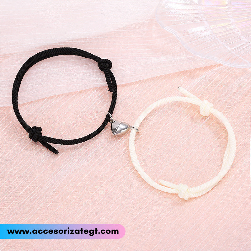 Set de pulseras para pareja elaboradas en cordón en colores blanco y negro, con imanes que forman un corazón.